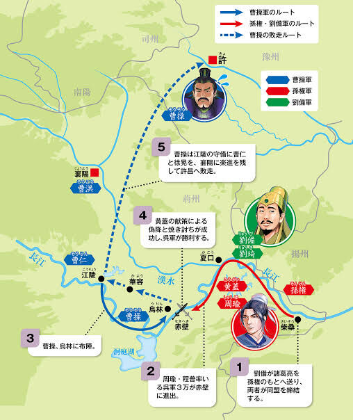 そして赤壁の戦いも、これとよく似た格好になった。208年、今度は華北の覇者となった曹操が、孫権(そんけん)、劉備(りゅうび)の連合軍と対した。南下する曹操軍は自前の北方の兵に、襄陽(じょうよう)の降兵を加えて公称80万。対する孫・劉連合軍は4~5万。官渡の戦い以上の兵力差だが、これも周知どおり圧倒的優位だった曹操軍が敗退した。