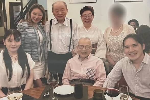 中央に座るのが眞鍋氏で、それを囲むように左から眞子さん、米国の鉄板焼きレストランチェーン「BENIHANA」創業者夫人の青木恵子氏、伊勢氏、眞鍋氏の妻・信子さんと続く。そして、その右隣に立つのが“謎の女”だ。