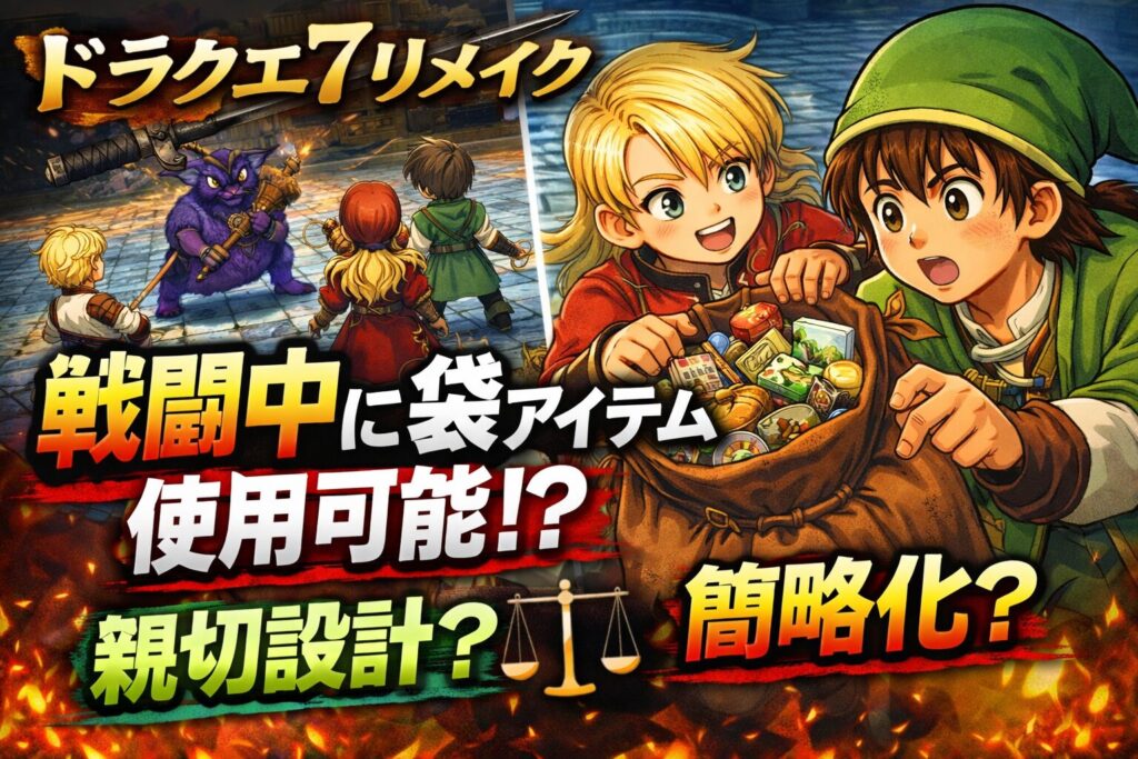 ドラクエ7リメイクの体験版にて、戦闘中でも「ふくろ」のアイテムを誰でも使用できる仕様が確認され、話題を集めています。賢者の石を誰に持たせるか悩む必要がなくなった一方、リソース管理の面白さが薄れたという声も出ています。本記事では、この変更に対する反応をまとめます。