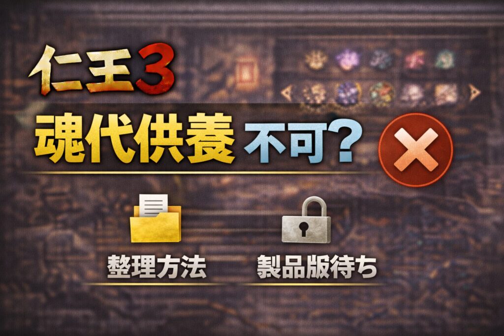 仁王3体験版を遊ぶ中で、魂代が増えすぎて整理に困るという声が上がっています。社で魂代供養を行おうとしても体験版では利用できず、捨てるしかない状況に戸惑うプレイヤーも多いようです。製品版での供養や称号解放を待つ意見も含め、反応をまとめました。