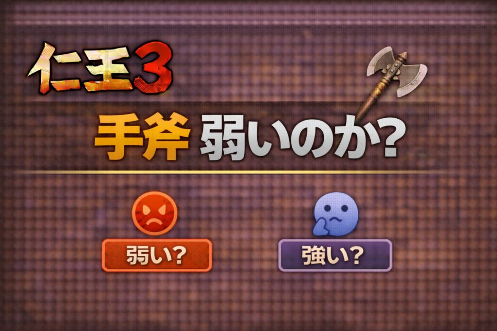 仁王3体験版において、手斧の評価を巡る議論が盛り上がっています。投擲性能の弱体化を不安視する声がある一方で、気焔や特定スキルの強さを評価する意見も見られます。体験版時点での使用感や、前作との違いを中心に、手斧の現状について整理します。