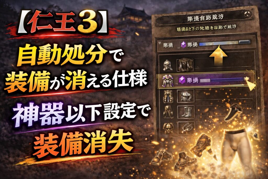 『仁王3』の自動処分機能を巡り、着用中の装備まで処分対象になる仕様が話題になっています。神器以下設定やレベル指定不可の挙動に対し、手間やリスクを指摘する声が上がっています。