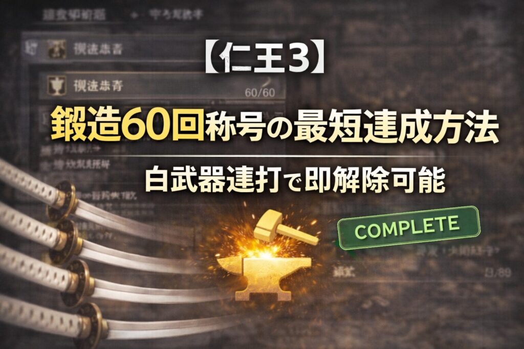 『仁王3』の称号「鍛造60回」は回数条件のみのため、通常プレイでは素材や資金を大きく消費しがちです。プレイヤー間では低レア装備を利用して効率よく回数を稼ぐ方法が共有されており、鍛造仕様を理解することで短時間で達成できる手順が確認されています。