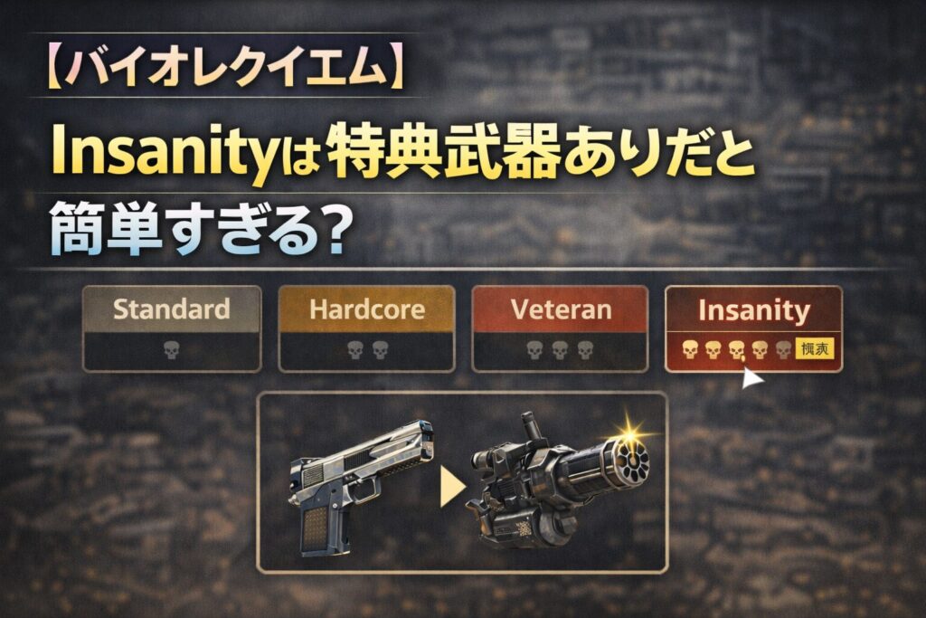 『バイオレクイエム』の最高難易度「Insanity」を巡ってプレイヤーの間で議論が起きています。特典武器ありだと簡単すぎる一方、特典なしで挑戦すると「地獄レベルに難しい」という声も。スレでは難易度バランスについてさまざまな意見が出ているようです。