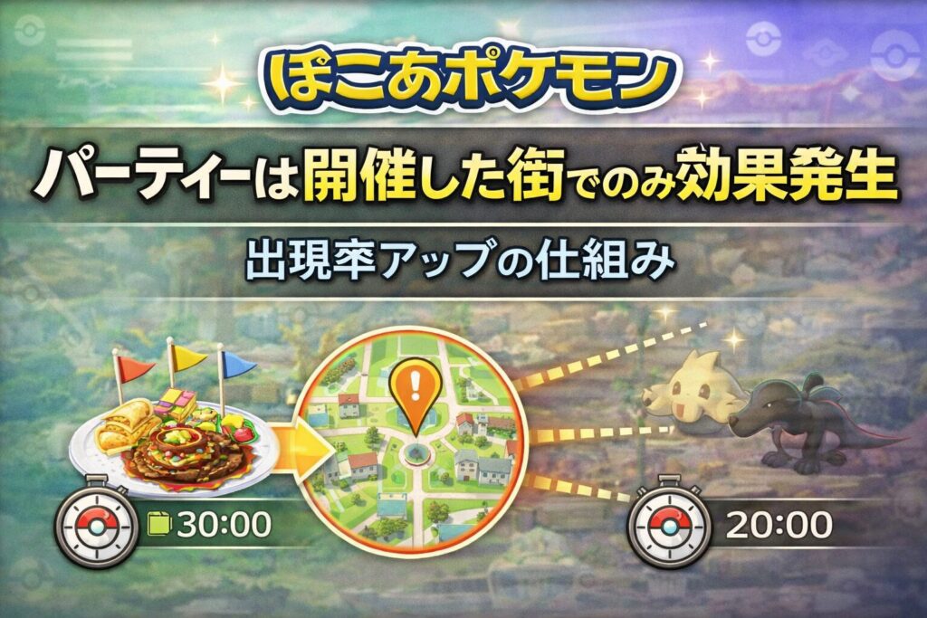 【ぽこあポケモン】パーティーは開催した街でのみ効果発生 出現率アップの仕組み