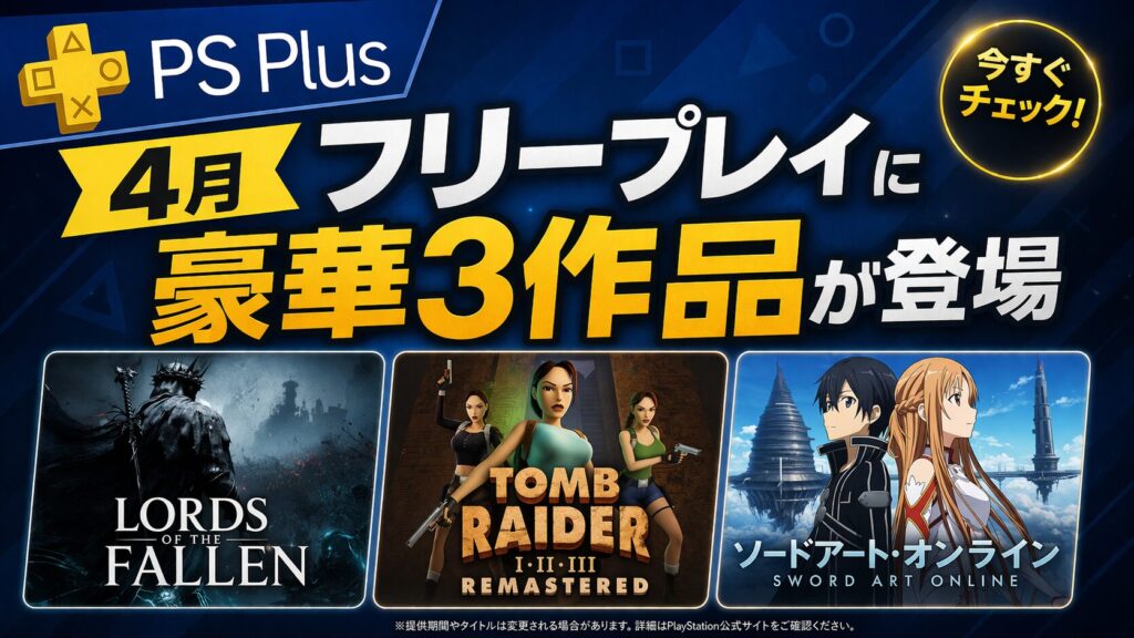 PS Plusの2026年4月フリープレイが4月2日に発表され、『Lords of the Fallen』『トゥームレイダー I-III リマスター』『ソードアート・オンライン フラクチュアード デイドリーム』の3本が配信対象となりました。発表直後から、内容に厳しい反応や意外と助かるという声まで幅広い意見が集まっています。