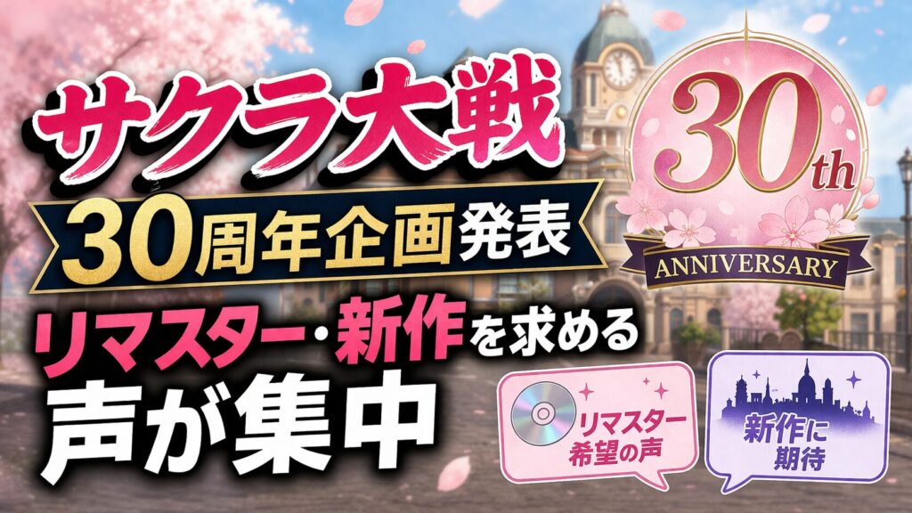セガが『サクラ大戦』シリーズ30周年企画を発表しました。グッズやイベント展開が予告される一方で、ユーザーからは過去作リマスターや新作への期待が集まっています。シリーズの今後に対する反応はさまざまで、方向性を巡る声も目立っています。