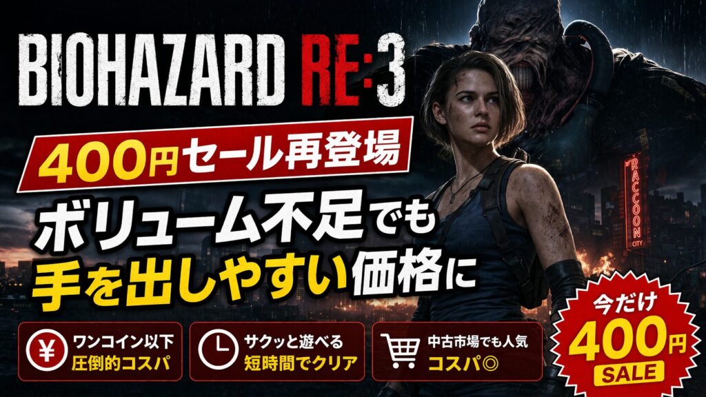 『バイオハザードRE3』が400円セールに戻ったことで、あらためて価格と内容のバランスに注目が集まっています。短さや削除要素を惜しむ反応がある一方、この値段なら十分遊べるという受け止め方も出ています。