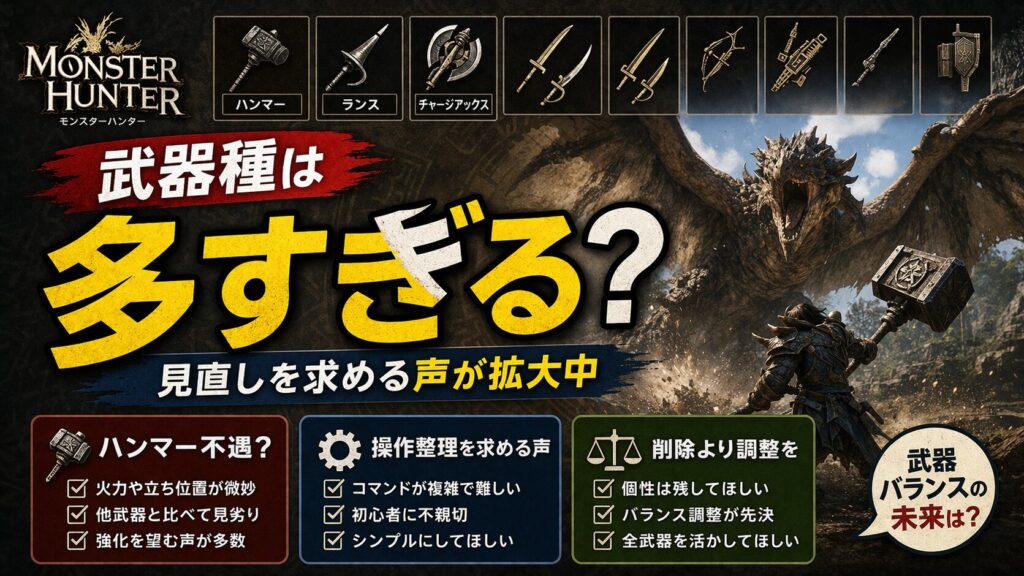 『モンハン』の武器種はそろそろ減らした方がいいのではないか、という話題です。ハンマーやランス、チャージアックスなどの名前が挙がる一方で、削除よりも調整や操作整理を求める声も多く、武器バランスそのものに注目が集まっています。