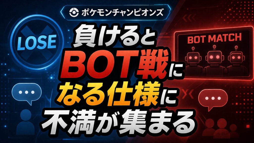 『ポケモンチャンピオンズ』のランクマッチにおいて、BOT戦が挟まれる仕様に関する不満が広がっている。特に敗北後にBOT戦が発生する挙動や、低ランク帯での対人戦の少なさが指摘されており、対戦体験への影響に注目が集まっている。